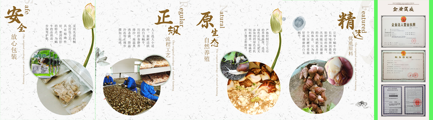 鮮活白玉蝸牛、白玉蝸牛種苗、白玉蝸牛凍肉供應,請聯系嘉興尚品食品有限公司。我公司成立于2013年,座落于杭嘉湖平原風景秀麗的江南小鎮新豐鎮南首棲凰埭農業園區,距離上海、杭州、蘇州不到100公里,相距滬杭高速乍加蘇高速以及跨海大橋北接線僅幾公里,地理位置優越,交通十分便利。嘉興尚品食品有限公司經過20多年來對白玉蝸牛的的飼養、試驗,摸索出一套較為完整的養殖技術,無論是在溫室中的運用還是在野外大田飼養均取得了明顯效果,不僅使蝸牛的產量有了大幅度的提高同時蝸牛的商品性和營養保健也發生了質的變化,主要表現在:一、明顯縮短飼養周期105-120天可達商品規格,二、采用了科學的飼料組合與微量元素的合理利用使白玉蝸牛既美麗又營養,得到有關方面的高度評價。公司秉承 “市場+公司+基地+農戶”的經營理念,先后與國內多家蝸牛養殖公司進行全方位的養殖、技術、市場的合作,采取專業化、集約化、工廠化的科學管理模式,確保穩定的價格、充足的貨源以及安全放心的蝸牛產品供應市場。同時誠邀立志從事蝸牛養殖的社會各界朋友加盟蝸牛養殖,我們將為你提供優良蝸牛種苗,免費提供養殖技術,簽定商品蝸牛回收合同,以滿足市場對“思耐兒”品牌蝸牛的需求。